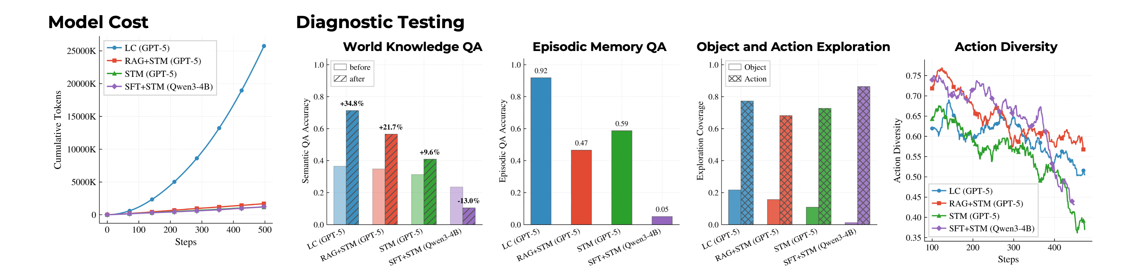 Adding short-term memory improves both RAG and SFT agents. Game progress and World Knowledge QA accuracy increase monotonically with short-term memory size. SFT agents augmented with short-term memory outperform vanilla short-term memory agents, confirming that parametric updates serve as effective long-term memory.