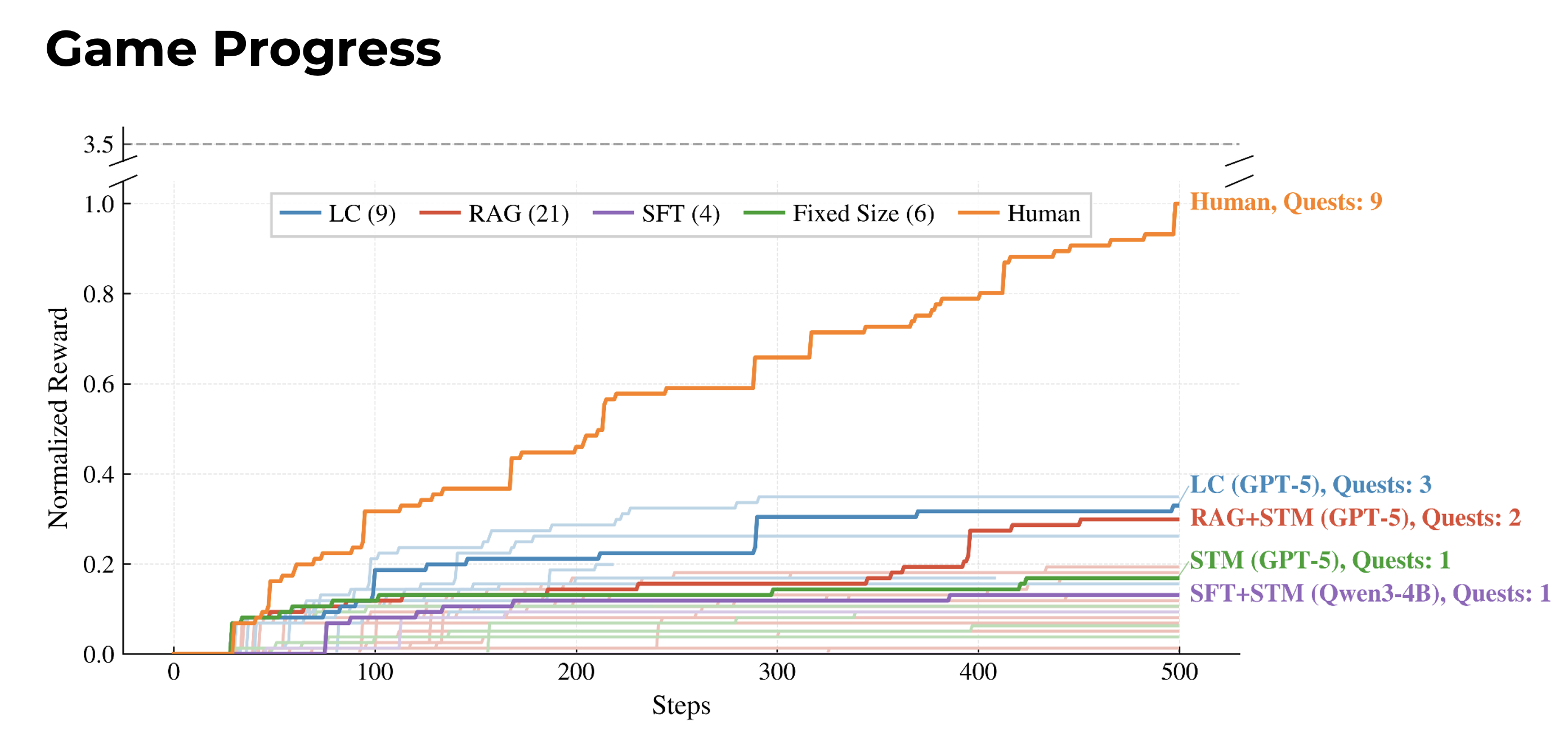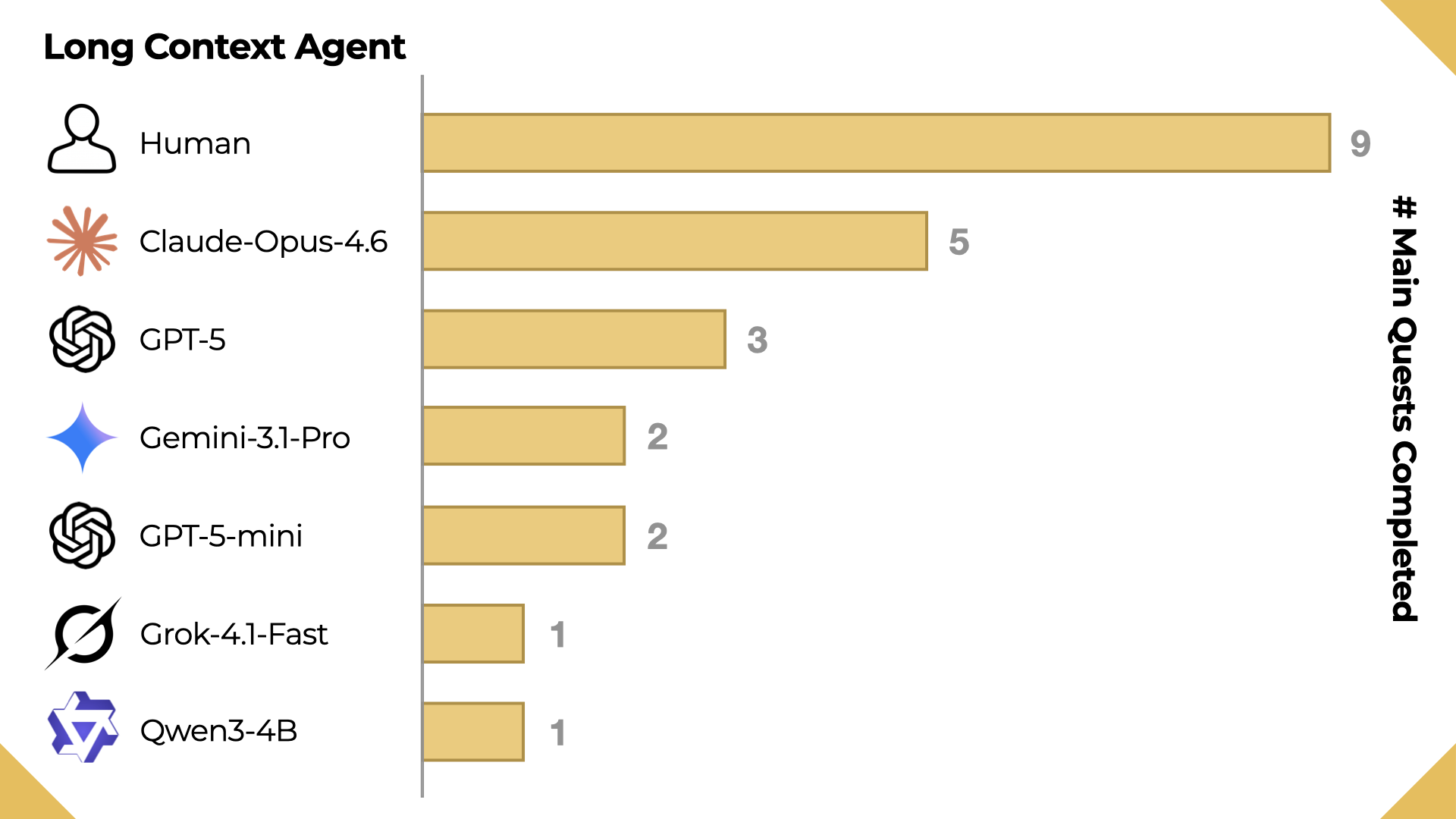 The Long Context agent achieves the strongest game progress, and performance degrades with weaker backbones (GPT-5 > GPT-5-mini > Qwen3-4B). Even the best-performing model, Claude Opus 4.6, still falls well below human performance.